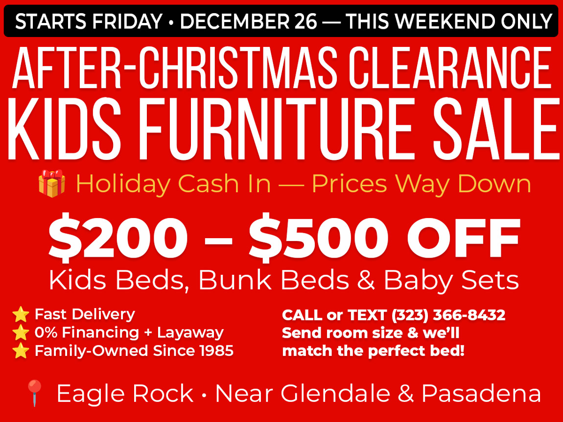 Affordable Bunk Beds, Cribs & More Searching for the best kids furniture in Los Angeles? At Kids Furniture Superstore, we offer affordable bunk beds, cribs, toddler beds, and loft beds all in-stock and ready for fast local delivery. Serving families from Glendale to Pasadena, we’re your one-stop shop for safe, stylish, and budget-friendly kids bedroom furniture. Since 1985, Kids Furniture Superstore has been the go-to place for families who want quality, style, and unbeatable prices. We proudly serve the entire Los Angeles area with a wide selection of: Bunk Beds Loft Beds Twin Beds and Full Beds Cribs and Nursery Furniture Kids' Desks, Dressers, and More Whether you're furnishing a toddler’s first room or upgrading a growing child's space, we have exactly what you need — and we’ll make it easy, affordable, and fun! Visit us at 2751 Colorado Blvd, Eagle Rock — Across from Eagle Rock Plaza!