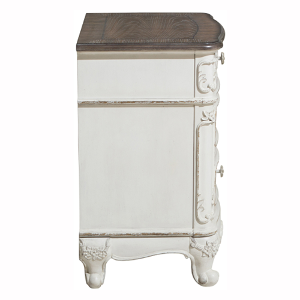This collection brings your little one’s dream to life with its enchanting design. The Victorian-inspired nightstand features floral motif hardware and traditional carvings, all beautifully crafted in a white with gray rub-through finish. Made from birch and ash veneers, wood, and engineered wood, this piece combines durability with a whimsical charm. The two-tone finish, blending antique white with gray rub-through and oak, adds to its fairy tale allure. It also offers three dovetail drawers with ball bearing glides for smooth functionality, accented by elegant gray-tone knobs.