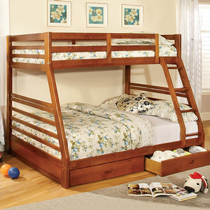 This twin over full bunk bed includes two large drawers for storage underneath and an attached ladder for easy access to the upper bed. The bunk bed comes in two finish options; dark walnut and the new introduction of oak.